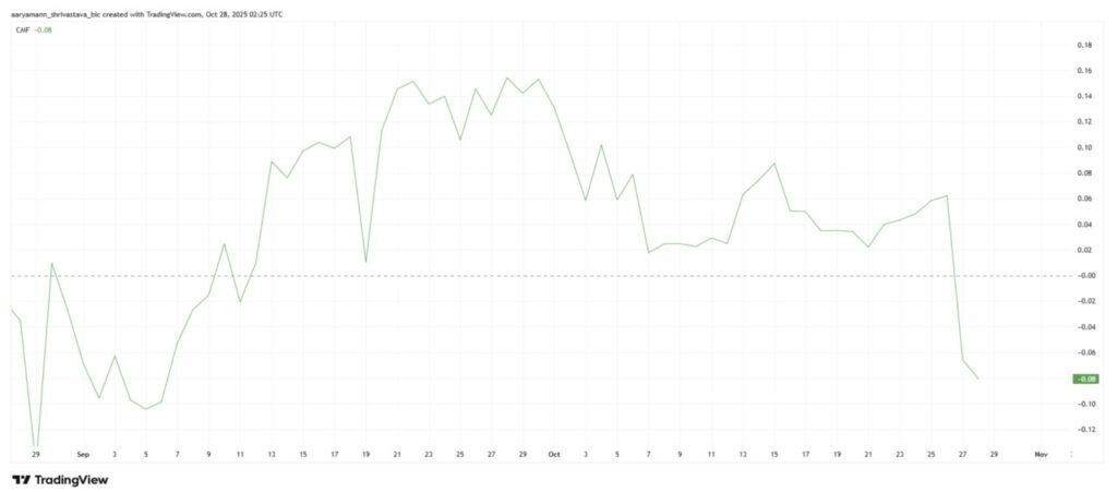 Indikator Chaikin Money Flow (CMF) menunjukkan sinyal peringatan bagi Pi Coin. Dalam 24 jam terakhir (28/10), CMF mengalami penurunan drastis dan mencapai level terendah dalam hampir dua bulan.