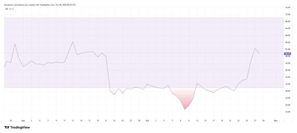 Namun, di sisi lain, indikator Relative Strength Index (RSI) justru memperlihatkan sinyal yang berbeda. Dalam 24 jam (28/10), RSI melonjak tajam — dari area bearish di bawah 50,0 ke zona positif. Kenaikan ini biasanya menunjukkan momentum bullish yang kembali menguat dan potensi kelanjutan kenaikan dalam jangka pendek.