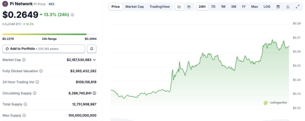 Kenaikan ini terjadi di tengah lonjakan volume perdagangan yang mencapai lebih dari $109 juta, menunjukkan minat pasar yang tinggi terhadap aset ini. Kapitalisasi pasar Pi Network kini berada di angka $2,18 miliar, dengan valuasi terdilusi penuh (FDV) mencapai $3,36 miliar.
