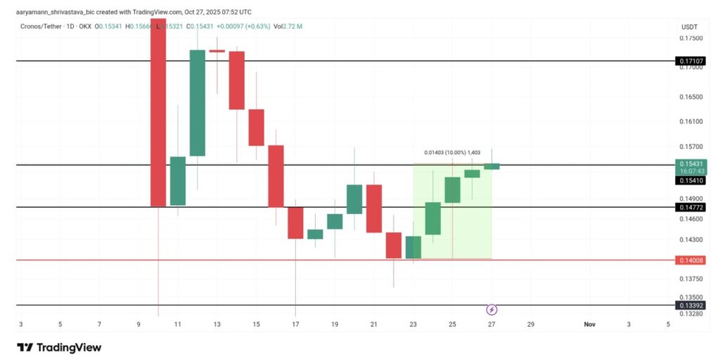 Pembaruan ini berpotensi mendorong harga CRO lebih tinggi, apalagi token ini telah naik 10% dalam sepekan terakhir ke level $0,154. Jika level ini berhasil dikonfirmasi sebagai support kuat, momentum bisa membawa CRO menuju $0,160 bahkan $0,171.