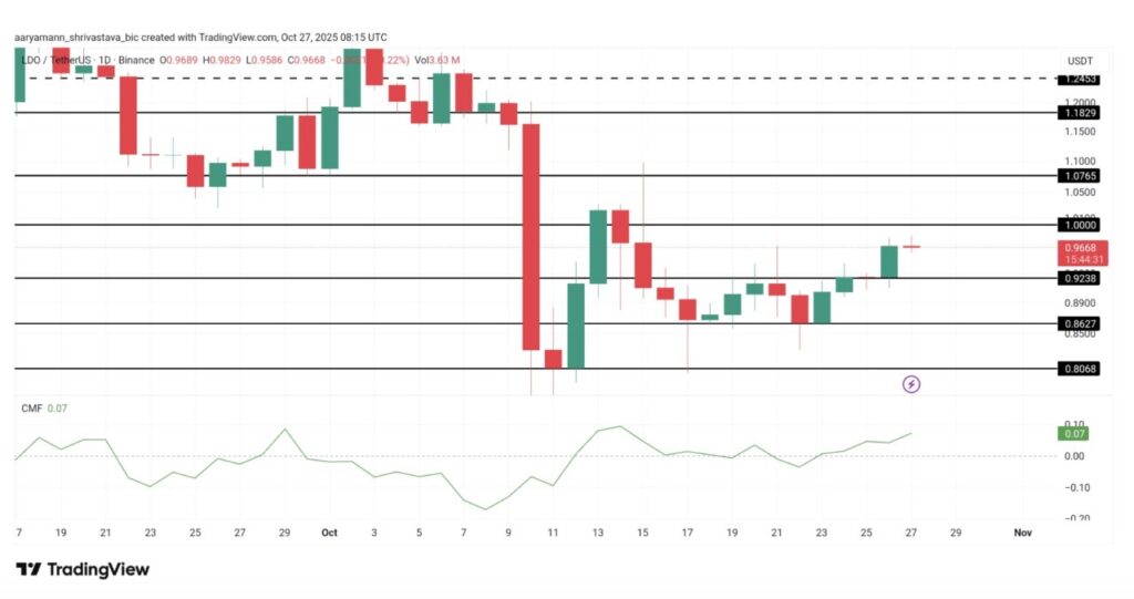 Jika momentum saat ini bertahan, harga LDO berpotensi menembus $1,00 dan naik menuju $1,07. Indikator Chaikin Money Flow (CMF) menunjukkan aliran dana investor yang konsisten, meskipun masih ada sedikit skeptisisme. Ini mencerminkan meningkatnya kepercayaan pasar dan dukungan modal terhadap reli harga.