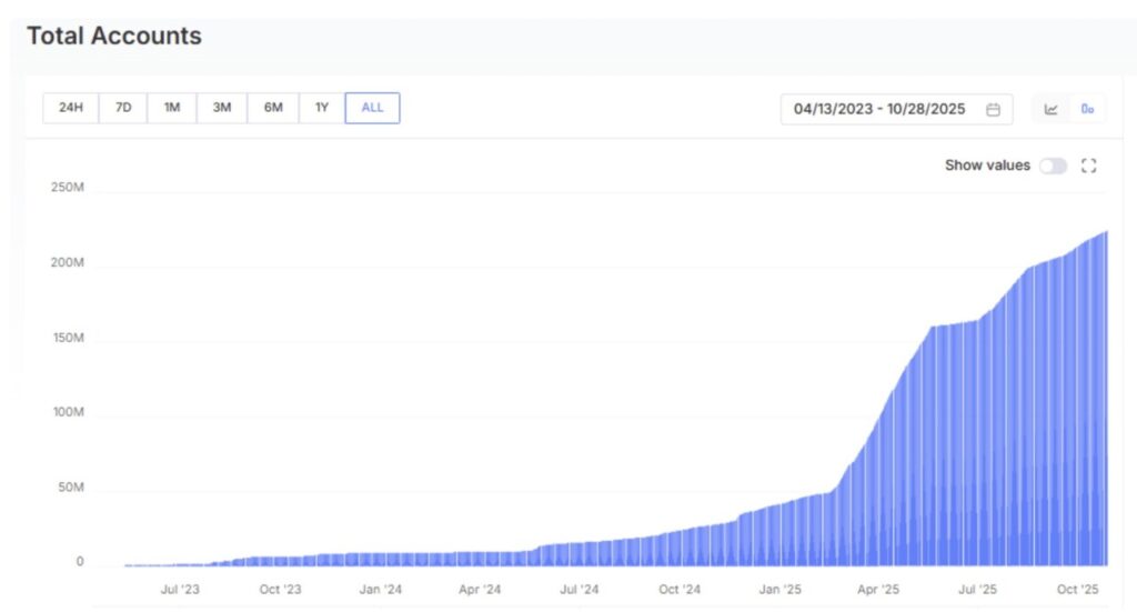Lebih mencengangkan lagi, pada 28 Oktober, tercatat 923.966 akun baru dibuat hanya dalam satu hari — menandakan momentum adopsi yang sangat cepat. Pertumbuhan aktivitas jaringan yang konsisten ini menegaskan kepercayaan investor serta memperkuat keberlanjutan jangka panjang dari ekosistem SUI.