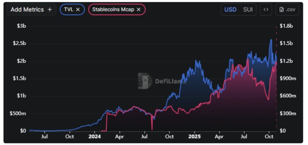 Kapitalisasi pasar stablecoin melonjak dari sekitar $560 juta ke $1,15 miliar pada saat artikel ini ditulis. Lonjakan ini mencerminkan meningkatnya likuiditas serta utilitas ekosistem SUI.