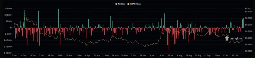 Namun kini, lonjakan inflow terbaru yang melebihi $10 juta telah mendorong harga HBAR menembus level $0,20 — memperkuat sinyal bullish jangka pendek.