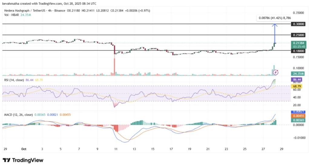Harga Hedera Hashgraph (HBAR) menunjukkan tren kenaikan yang kuat, diperdagangkan di level $0,213 per 28 Oktober 2025, setelah mencatat lonjakan 15%.