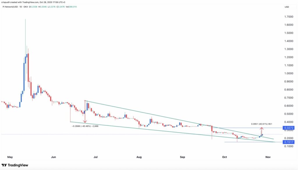 Target harga dari pola falling wedge biasanya dihitung dari jarak bagian terluas pola, lalu jarak yang sama diukur dari titik breakout. Dalam kasus ini, jaraknya sekitar 40%, yang berarti harga Pi dapat naik hingga $0,3272. Jika berhasil menembus level tersebut, target berikutnya bisa mencapai $0,50.
