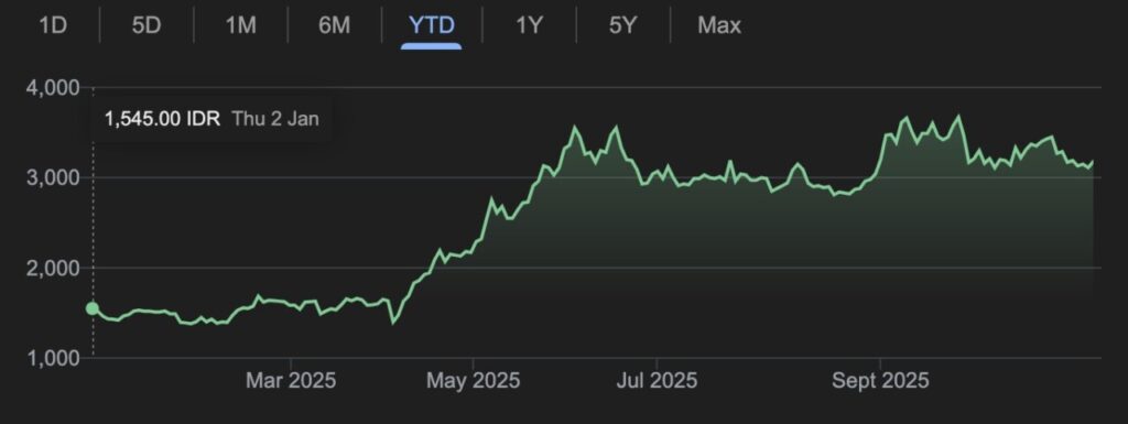 Di sisi lain, saham PT Aneka Tambang Tbk (ANTM) mencatat performa luar biasa pada paruh kedua 2025. Setelah stagnan di kisaran Rp1.600-an pada awal tahun, harga saham ANTM kini melonjak lebih dari 197%, mencapai area Rp4.800 per lembar pada akhir Oktober 2025.