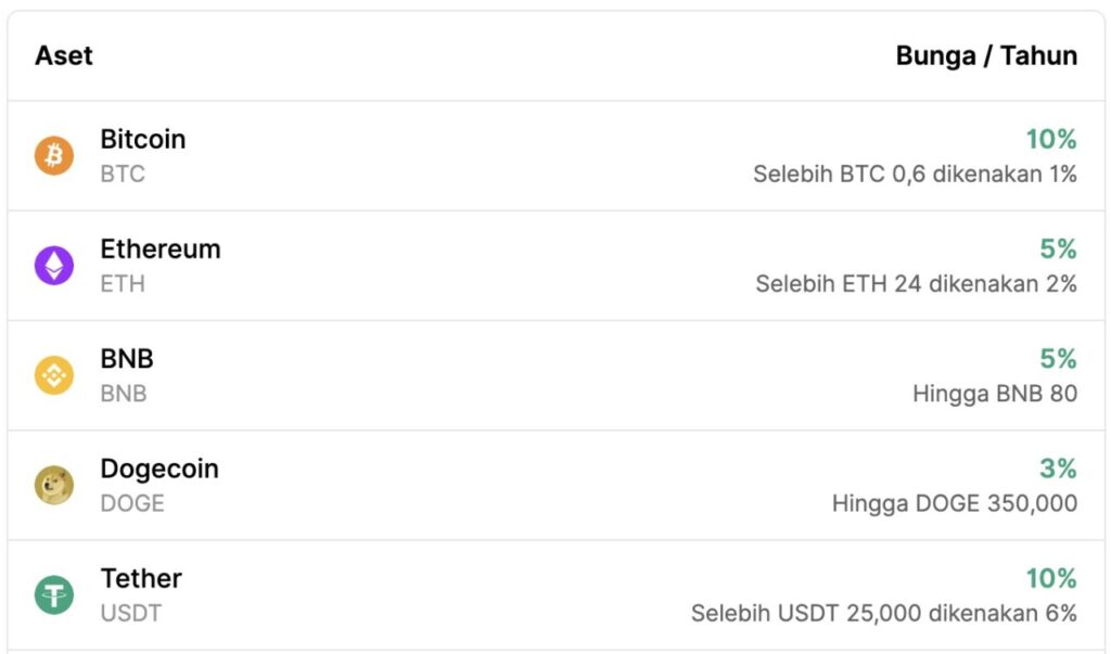 Token BNB di Pintu Earn menawarkan bunga tahunan sekitar 5%, khusus hingga saldo BNB 80 token. Hal ini menjadikannya alternatif menarik bagi mereka yang memiliki BNB dalam jumlah menengah dan ingin memaksimalkan utilitas aset sambil tetap memperoleh penghasilan pasif. Sebagai token yang digunakan di ekosistem Binance dan berbagai aplikasi yang terhubung, BNB memiliki likuiditas dan ekosistem yang mapan.