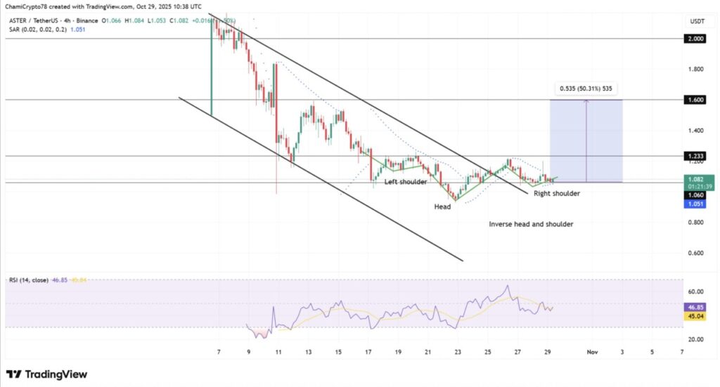Mengutip laporan Coingape, harga ASTER baru saja keluar dari pola channel menurun yang selama berminggu-minggu membatasi pemulihan harga. Breakout ini juga bertepatan dengan terbentuknya pola inverse head-and-shoulders, yang dikenal sebagai sinyal pembalikan bullish yang kuat.