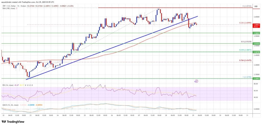 Ripple (XRP) memulai kenaikan baru setelah berhasil bertahan di atas $2,50. Harga berhasil melewati level resistensi $2,550 dan $2,60. Para pelaku pasar mampu mendorong harga melewati $2,650, mencapai puncak di $2,6972. Namun, tidak lama setelah itu, Ripple (XRP) mulai mengalami koreksi ke bawah. Harga turun di bawah level retracement Fibonacci 23,6% dari kenaikan terakhir dari $2,327 ke $2,6972.