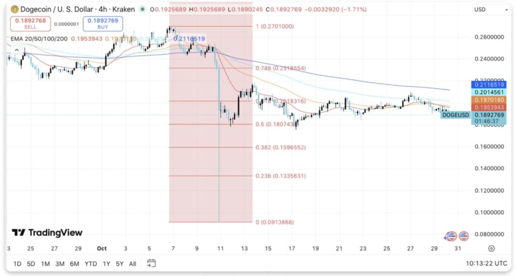 Grafik Dogecoin menunjukkan pola retracement Fibonacci yang luas dari $0,27 ke $0,091. Level retracement 0,5 di sekitar $0,1807 sejauh ini tetap bertahan sebagai area support, di mana para pembeli terus mempertahankan posisinya.