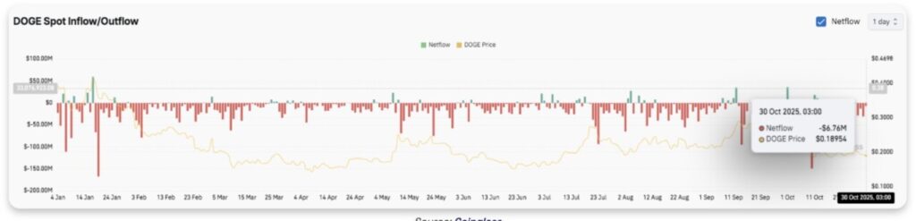 Data pasar spot Dogecoin menunjukkan adanya arus keluar yang terus-menerus, dengan total mencapai $6,76 juta pada 30 Oktober 2025. Tren ini mengindikasikan bahwa investor sedang melakukan aksi ambil untung, serta menunjukkan akumulasi yang terbatas.