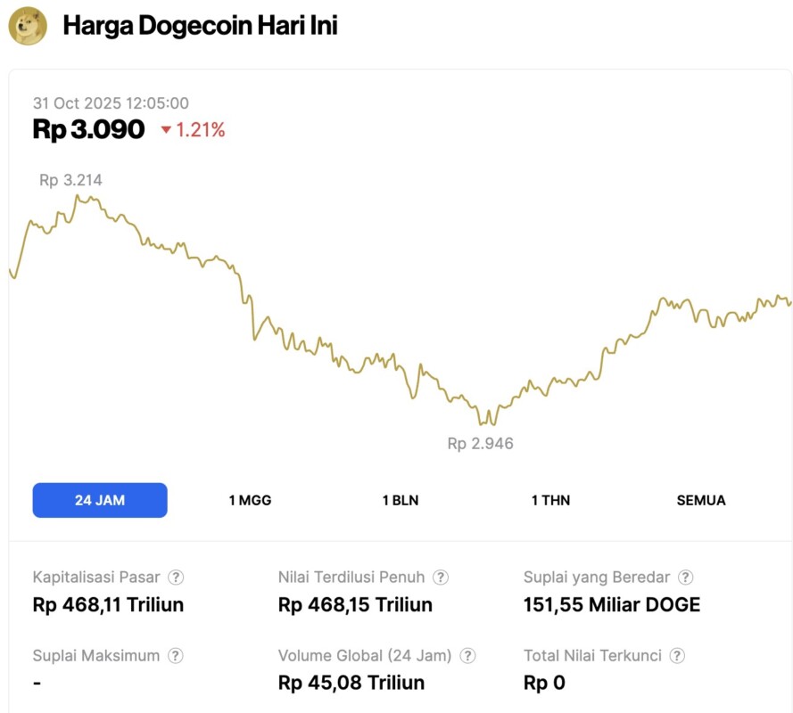 Pada 31 Oktober 2025, harga Dogecoin tercatat mengalami koreksi 1,21% dalam waktu 24 jam, diperdagangkan pada harga $0.1855 atau setara dengan Rp3.090. Dalam periode 24 jam terakhir, harga DOGE bergerak dalam kisaran Rp3.214 hingga Rp2.946.