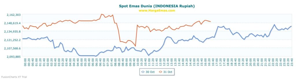 Jika meninjau grafik pergerakan emas spot dalam satu hari, terlihat tren naik yang cukup konsisten sepanjang sesi perdagangan 31 Oktober. Grafik dari HargaEmas.com menunjukkan bahwa harga sempat menyentuh level tertinggi harian Rp2.162.303 dan berada di atas level support Rp2.110.309.