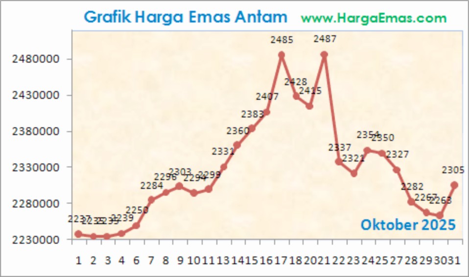 Meski saat ini harga menunjukkan penguatan, fluktuasi harga masih menjadi perhatian. Grafik harga Antam selama Oktober menunjukkan puncak tertinggi di Rp2.487.000 pada 20 Oktober, sebelum terkoreksi tajam hingga menyentuh Rp2.262.000 pada akhir bulan.