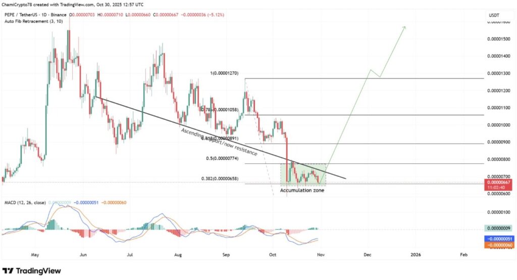 Grafik harian (30/10) mendukung prediksi jangka panjang harga Pepe Coin, menunjukkan pola konsolidasi dalam zona akumulasi antara $0.0000065–$0.0000070. Setelah harga menembus ke bawah garis support naik (ascending support), area tersebut kini berubah menjadi zona resistensi — menjadi titik penentu penting bagi arah reli selanjutnya.