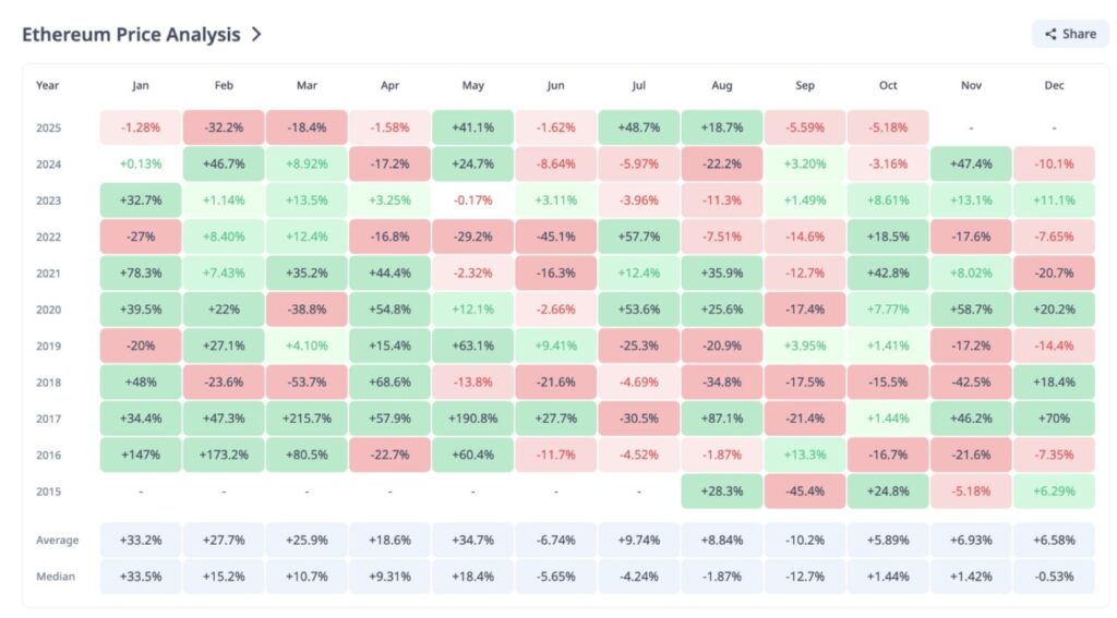 Namun secara historis, bulan November cenderung menguntungkan bagi Ethereum — dengan rata-rata kenaikan bulanan sebesar 6,93%, di mana lonjakan tahun lalu menjadi sorotan utama.