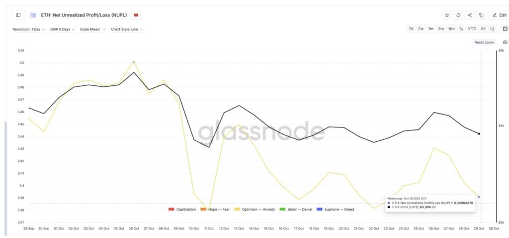 Indikator Net Unrealized Profit/Loss (NUPL) — yang mengukur apakah investor saat ini berada dalam posisi untung atau rugi — telah turun dari 0,43 menjadi 0,39 sejak 26 Oktober, atau turun sekitar 9,3%. Angka ini mendekati level terendah bulanan di 0,38, yaitu titik yang sebelumnya memicu kenaikan harga ETH sebesar 13% (dari $3.750 menjadi $4.240).