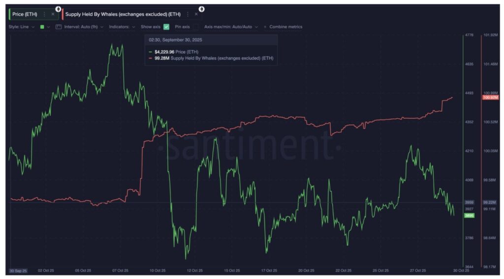 Menurut data dari Santiment, dompet yang memegang antara 1.000 hingga 100.000 ETH telah meningkatkan saldo mereka dari 99,28 juta menjadi 100,92 juta ETH sepanjang bulan Oktober — pembelian yang konsisten meskipun harga Ethereum turun sekitar 7% dalam sebulan. Ini setara dengan penambahan sekitar 1,64 juta ETH, atau sekitar $6,4 miliar berdasarkan harga saat ini.