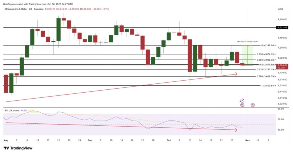 Pola ini mendukung pandangan bahwa keyakinan para whale bisa mengalahkan kelemahan jangka pendek, menguatkan tren naik secara keseluruhan. Selama tiga bulan terakhir, ETH masih mencatat kenaikan lebih dari 5% — mendukung tren naik tersebut. Saat ini, Ethereum diperdagangkan di kisaran $3.860, dengan level resistensi berada di sekitar $4.070 dan $4.240.