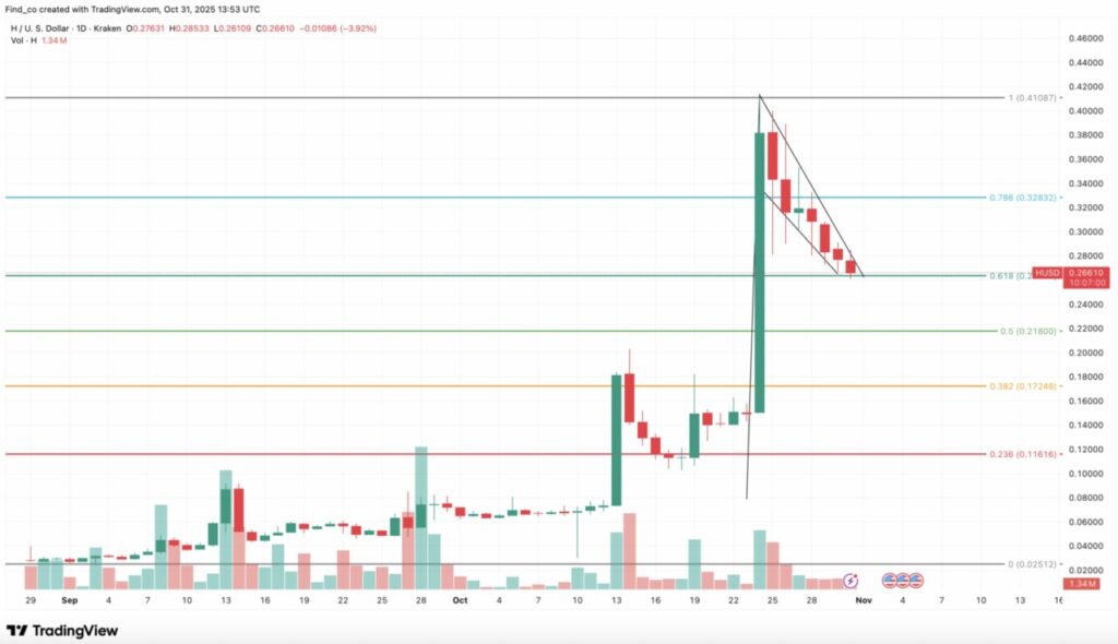 Namun, jika harga gagal bertahan di level support utamanya, pola ini bisa gagal terbentuk. Dalam skenario tersebut, harga H berpotensi turun ke sekitar $0,17 akibat aksi ambil untung dari para trader.