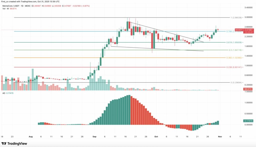 MemeCore (M) merupakan altcoin lain yang berpotensi mencetak rekor tertinggi baru pada November 2025. Saat ini, harga M diperdagangkan di level $2,45 — hanya sekitar 16% di bawah harga tertingginya sepanjang masa.