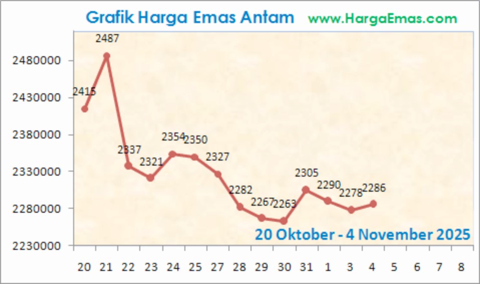 Menurut grafik harga Antam dari HargaEmas.com, harga emas batangan bergerak menurun sejak 21 Oktober 2025 ketika sempat menyentuh puncak di Rp2.487.000 per gram. Setelah itu, tren koreksi berlanjut hingga ke level terendah di sekitar Rp2.263.000 per gram pada 29 Oktober.