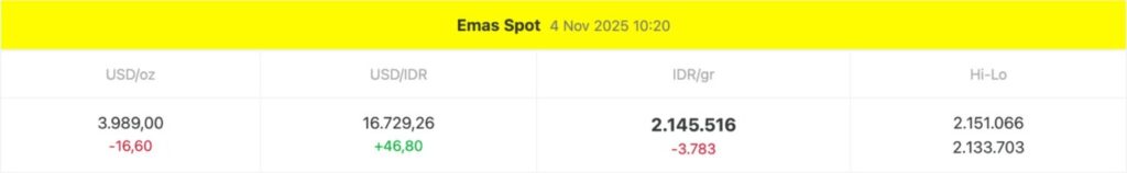 Berdasarkan data harga spot emas dunia dari HargaEmas.com, pada 4 November 2025 pukul 10:20 WIB, harga emas tercatat di Rp2.145.516 per gram, turun tipis sebesar Rp3.783 dibandingkan hari sebelumnya. Dalam satuan internasional, harga spot emas berada di US$3.989 per troy ounce, atau sekitar Rp66.338.502 jika dikonversi menggunakan kurs Rp16.618 per dolar AS.