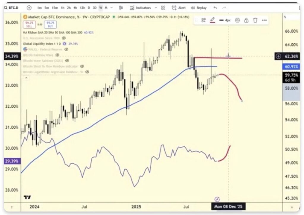 Dari sudut pandang teknikal, Dennis Liu meyakini bahwa dominasi Bitcoin (BTC) dalam time frame mingguan sedang membentuk pola lower high, yang diyakini akan menjadi pemicu fase berikutnya dari altseason 2025.