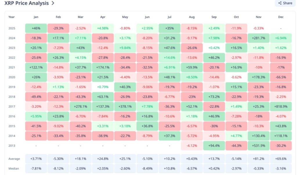 Sebagai perbandingan, Desember hanya mencatat rata-rata 69,6%. Fakta ini menjadikan November sebagai bulan yang paling banyak diburu investor XRP dalam 12 tahun terakhir.