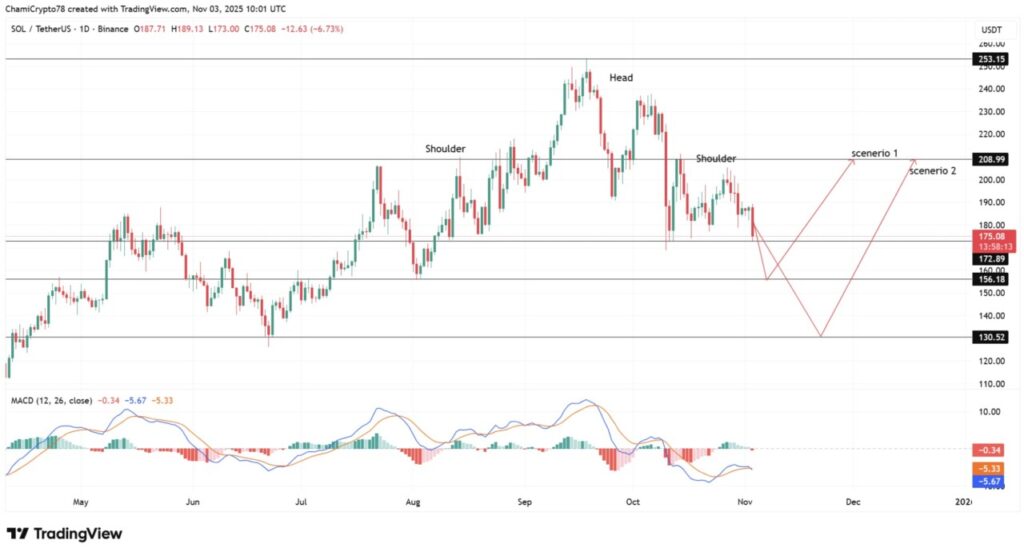 Struktur harga Solana saat ini menunjukkan pola teknikal klasik head-and-shoulders, yang mencerminkan pertarungan antara pembeli yang mulai kelelahan dan penjual (short-sellers) yang semakin percaya diri. Garis leher (neckline) di level $172 kini menjadi batas krusial antara potensi penurunan lebih lanjut atau pemulihan harga.