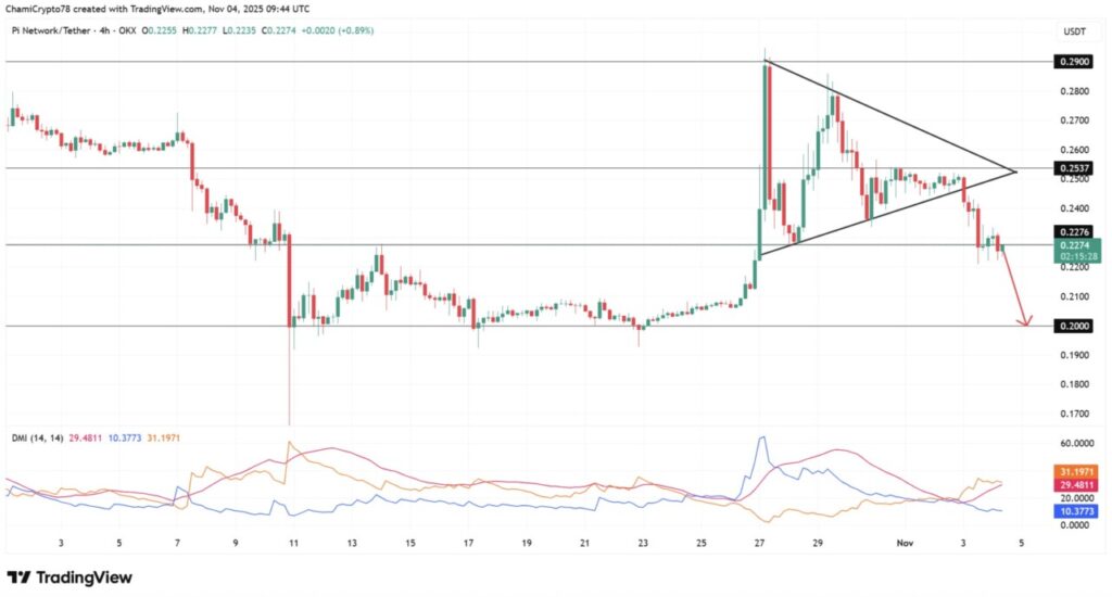 Harga Pi Coin terus berada di bawah tekanan setelah menembus pola segitiga simetris pada 3 November, menandakan bahwa penjual kembali menguasai pasar. Penurunan di bawah level $0,2276 menghapus kenaikan sebelumnya dan mengubah level tersebut menjadi zona pertahanan bagi para penjual.