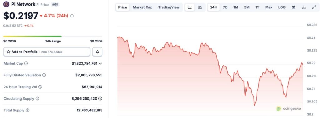 Jakarta, Pintu News – Harga Pi Network terus mengalami tekanan setelah turun sebesar 4,7% hari ini menjadi $0,2197. Penurunan ini mencerminkan meningkatnya kehati-hatian di kalangan investor menjelang acara pembukaan token sebesar 2,4% pada bulan November.