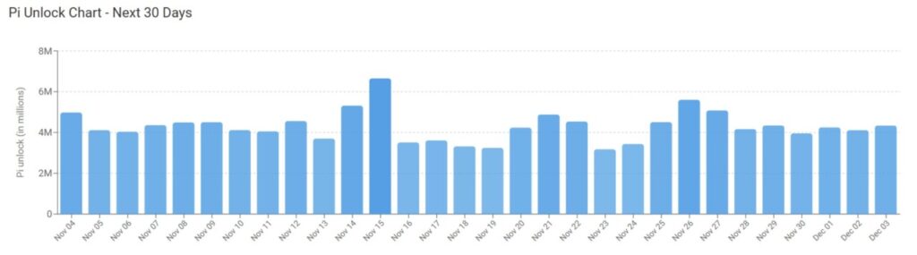 Acara pembukaan token Pi yang akan datang menambah tekanan besar pada pasar yang sudah rapuh. Sekitar 121,5 juta token Pi — setara dengan sekitar 2,39% dari total pasokan yang masih terkunci — akan mulai masuk ke sirkulasi sepanjang bulan ini.