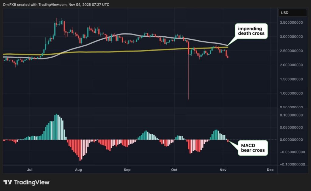 Meskipun death cross tidak selalu dapat diandalkan sepenuhnya sebagai indikator tunggal, kehadirannya bersamaan dengan kelemahan pasar yang lebih luas, termasuk perjuangan terkini Bitcoin , menambah sentimen hati-hati di sekitar XRP. Hal ini diperkuat dengan histogram MACD pada grafik harian XRP yang menunjukkan crossover bearish, menandakan pergeseran momentum negatif yang diperbarui.