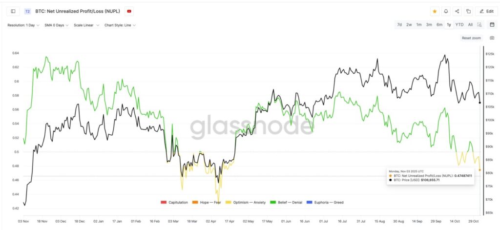 Saat ini, Bitcoin (BTC) berada di sekitar $106.900, sedikit di atas retracement Fibonacci 0,786 di $106.300, yang bertindak sebagai dukungan jangka pendek pada Oktober. Jika level ini terpatahkan, target berikutnya berada di dekat $103.500. Hal ini akan mengakibatkan penurunan sekitar 3%–4% dan akan menurunkan NUPL lebih lanjut.