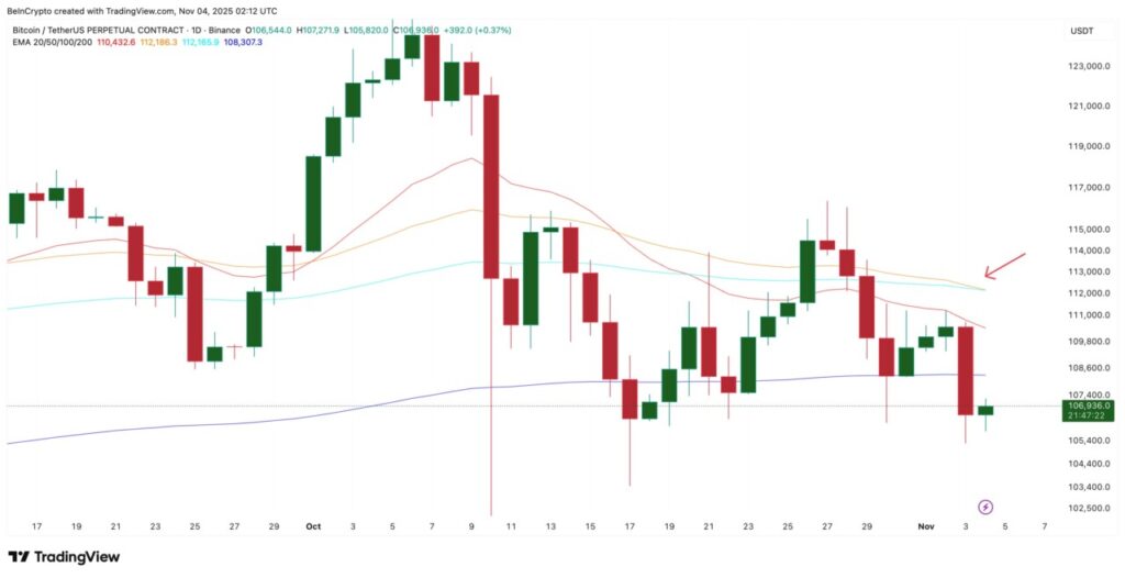 Bearish crossover terjadi ketika moving average eksponensial jangka pendek, seperti EMA 50-hari, melintasi di bawah moving average jangka panjang, seperti EMA 100-hari. Pada grafik harian Bitcoin (BTC), crossover ini sedang terbentuk. Ini adalah indikator penting karena menunjukkan bahwa penjual jangka pendek mulai mendominasi pasar dibandingkan pemegang jangka panjang.