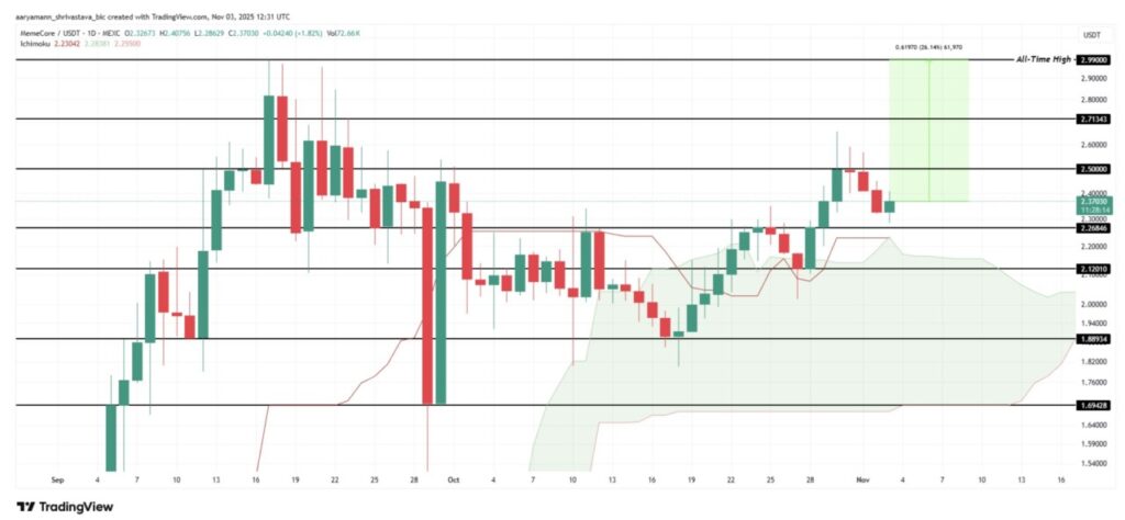 Indikator Ichimoku Cloud mengindikasikan momentum bullish yang kuat, memberi sinyal bahwa Memecore berpotensi melanjutkan kenaikannya. Saat ini, altcoin tersebut berada sekitar 26% di bawah rekor tertingginya di $2,99.