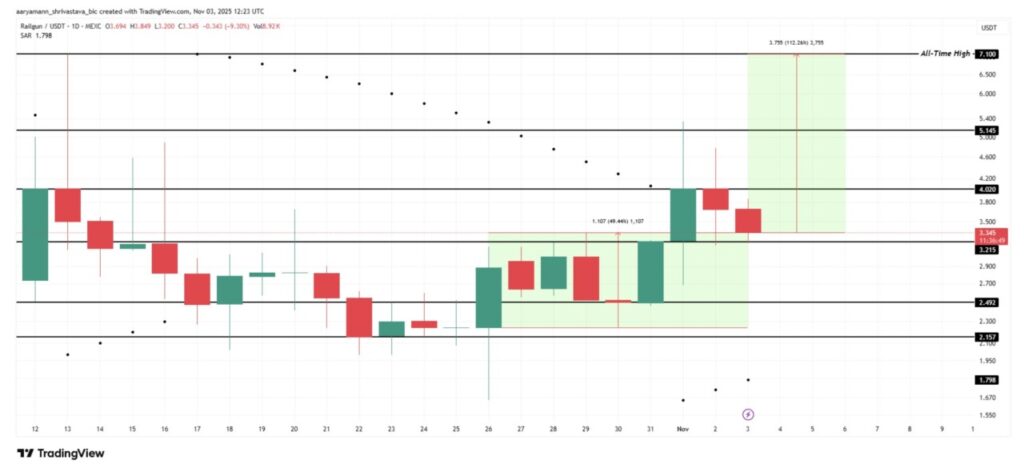 RAIL muncul sebagai salah satu altcoin dengan pertumbuhan tercepat bulan ini, dan saat ini diperdagangkan di harga $3,34. Kemungkinan pantulan dari level support $3,21 dapat memicu tekanan beli baru. Jika momentum terus menguat, harga RAIL berpotensi menembus $4,02, menandakan kelanjutan tren bullish jangka pendek yang kuat.