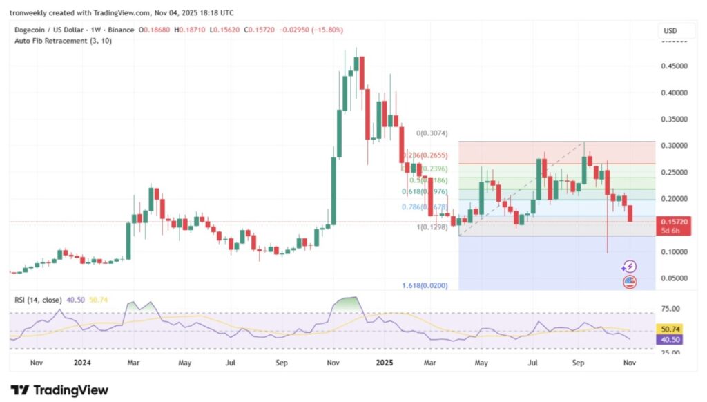 Grafik teknikal terbaru untuk Dogecoin menunjukkan adanya kelemahan. Indikator Auto Fibonacci mengidentifikasi level 0.786, yang berada di sekitar $0,164, sebagai area resistensi.