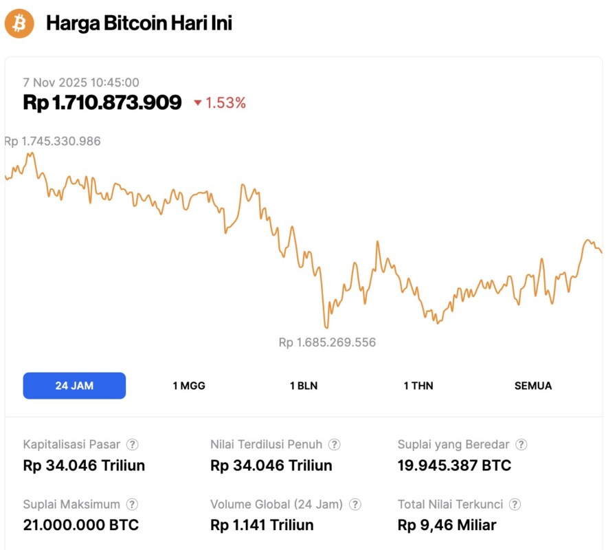 Pada 7 November 2025, harga Bitcoin tercatat berada di level $101,997 atau setara dengan Rp1.710.873.909, mengalami penurunan 1,53% dalam 24 jam terakhir. Sepanjang periode ini, BTC menyentuh level terendahnya di Rp1.685.269.556 dan harga tertingginya di Rp1.745.330.986.