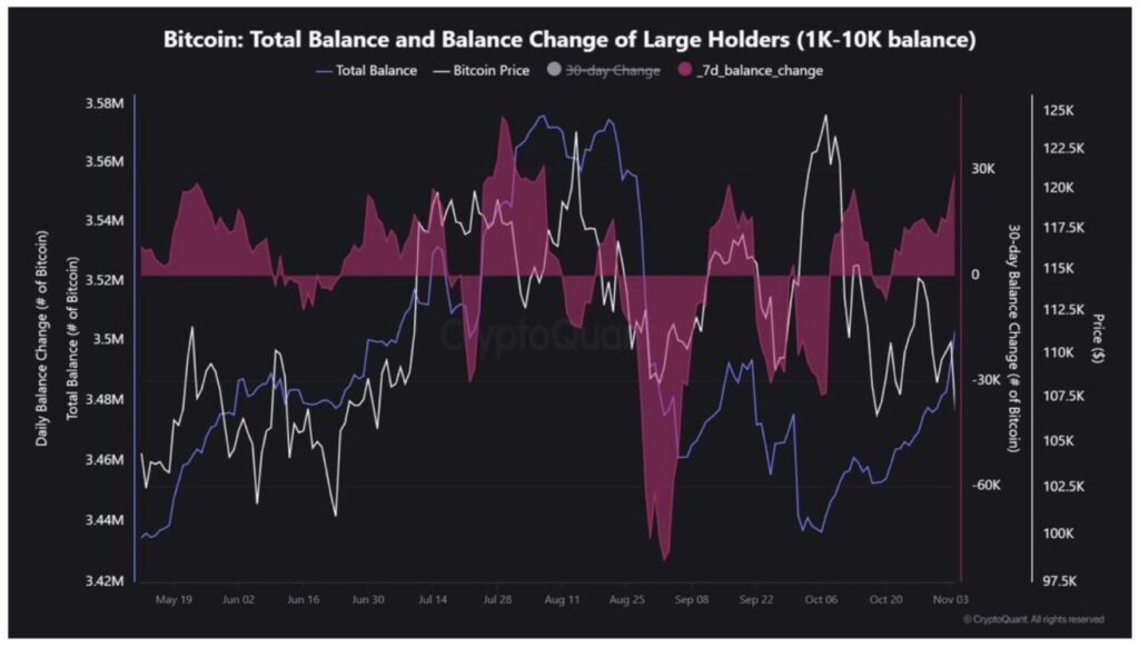 Berdasarkan data dari CryptoQuant, dompet-dompet yang menyimpan antara 1.000 hingga 10.000 BTC telah menambahkan sekitar 29.600 Bitcoin dalam tujuh hari terakhir.