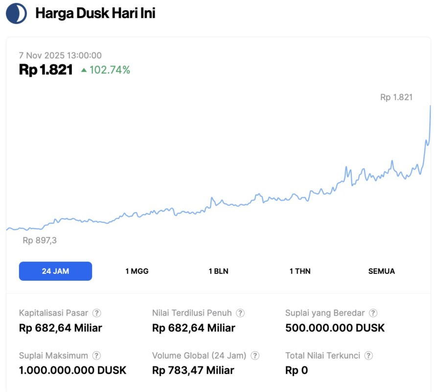 Harga crypto Dusk (DUSK) mencatat lonjakan spektakuler dalam 24 jam terakhir, dengan nilai melonjak hingga 102,74% dan diperdagangkan di angka Rp1.821 pada 7 November 2025. Kenaikan ini hampir dua kali lipat dari harga sebelumnya di kisaran Rp897,3, menunjukkan momentum pasar yang sangat kuat.