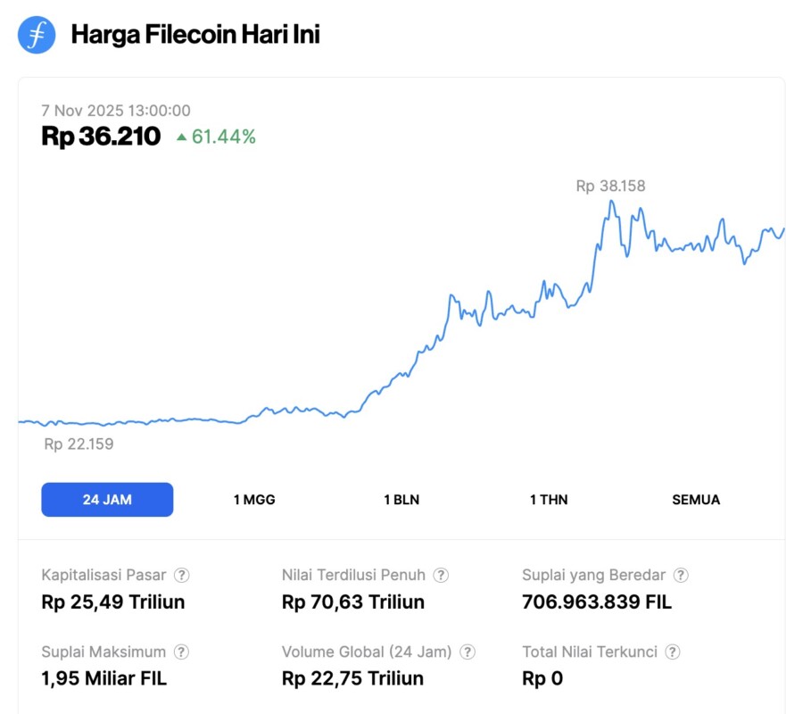 Selanjutnya, harga Filecoin juga mengalami lonjakan signifikan dalam 24 jam terakhir, naik sebesar 61,44% dan diperdagangkan pada angka Rp36.210 per FIL. Peningkatan ini menandai kebangkitan tajam dari posisi terendah hariannya di Rp22.159, bahkan sempat menyentuh puncak tertinggi harian di Rp38.158 sebelum sedikit terkoreksi.