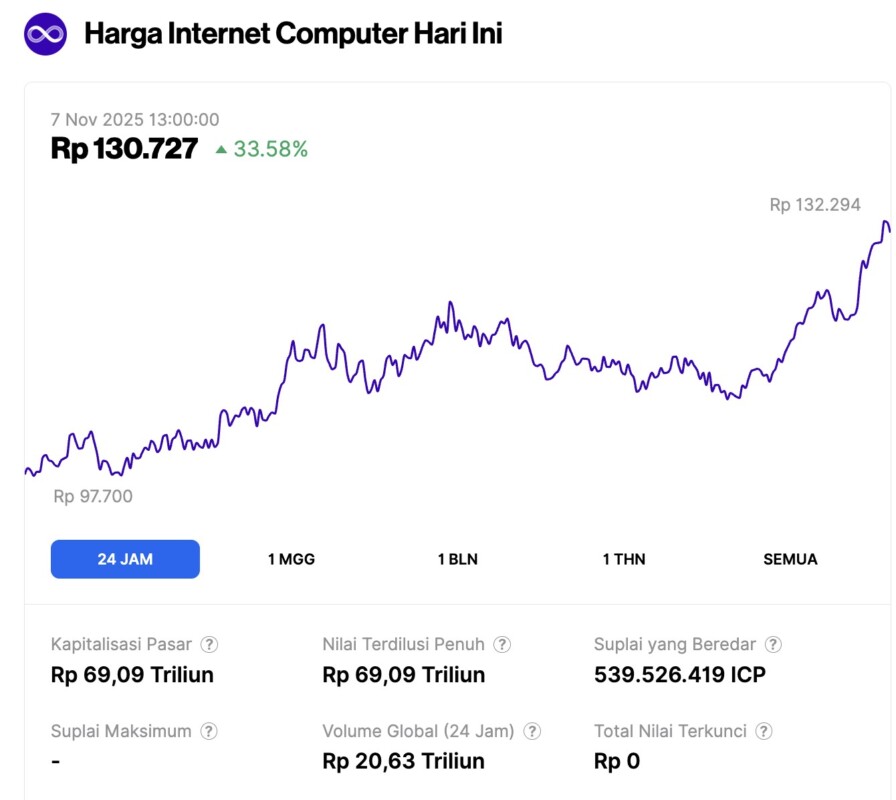 Dengan lonjakan ini, kapitalisasi pasar ICP kini berada di angka Rp69,09 triliun, yang sama dengan nilai terdilusi penuh, menandakan bahwa seluruh token yang direncanakan telah beredar. Volume perdagangan global ICP dalam 24 jam terakhir juga sangat tinggi, yakni mencapai Rp20,63 triliun, menunjukkan tingginya antusiasme investor terhadap aset ini.