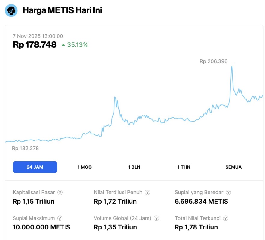 Kenaikan signifikan ini turut mengerek kapitalisasi pasar METIS menjadi sekitar Rp1,15 triliun, sementara nilai terdilusi penuh mencapai Rp1,72 triliun. Menariknya, volume perdagangan global dalam 24 jam terakhir juga tercatat tinggi, yakni mencapai Rp1,35 triliun, menandakan minat beli yang sangat aktif dari pelaku pasar.
