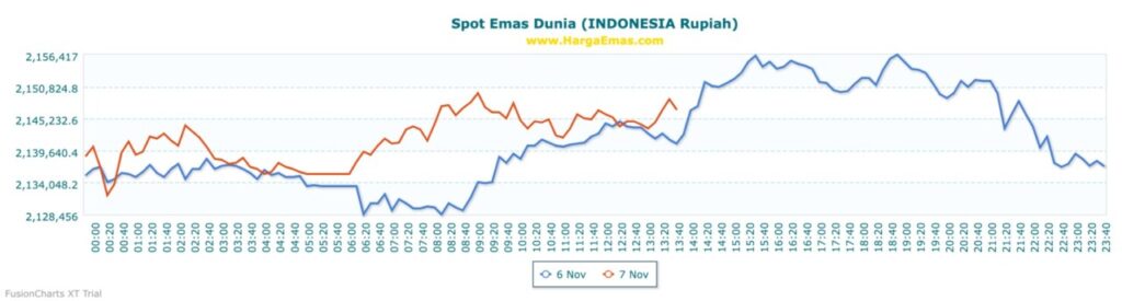 Melalui grafik intraday spot emas dalam rupiah (7 November 2025), terlihat bahwa harga emas bergerak relatif stabil pada kisaran Rp2.134.000 hingga Rp2.145.000 hingga pukul 13:00 WIB. Kenaikan signifikan terjadi pada sesi siang hingga sore hari, sebelum sedikit terkoreksi menjelang malam.
