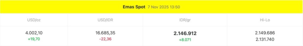 Berdasarkan data Emas Spot per 7 November 2025 pukul 13:50 WIB, harga emas dunia berada di level USD 4.002,10 per troy ounce, naik USD 19,70 dari hari sebelumnya.