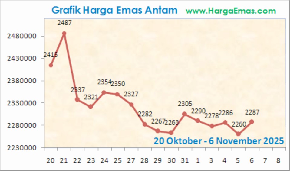 Dari grafik historis 20 Oktober ā 6 November 2025, harga emas Antam sempat berada di puncaknya di angka Rp2.487.000/gram pada 21 Oktober. Setelah itu, terjadi tren penurunan bertahap yang mencapai titik terendah di Rp2.260.000 pada 6 November 2025.