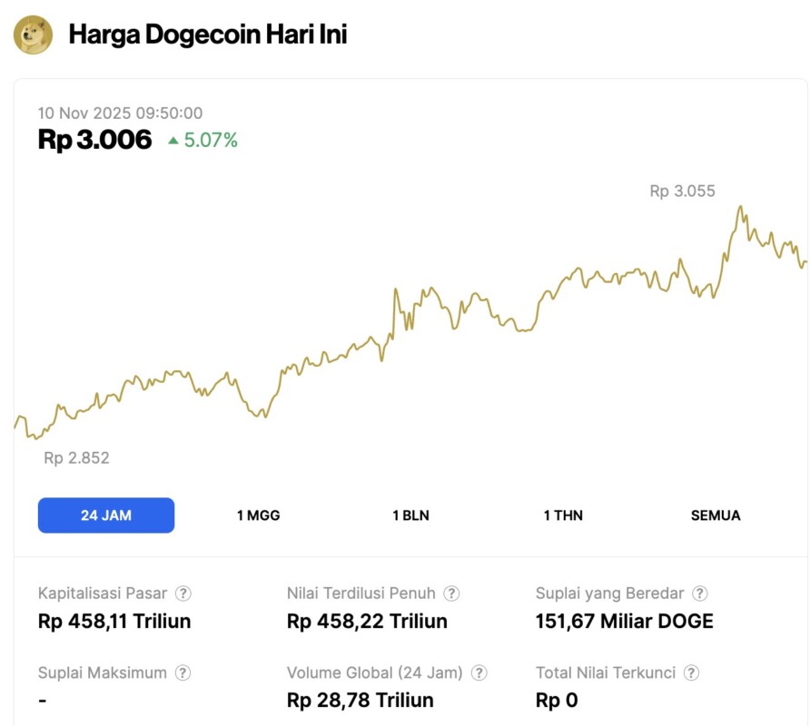 Pada 10 November 2025, harga Dogecoin tercatat mengalami kenaikan 5,07% dalam waktu 24 jam, diperdagangkan pada harga $0.1806 atau setara dengan Rp3.006. Dalam periode 24 jam terakhir, harga DOGE bergerak dalam kisaran Rp2.852 hingga Rp3.055.
